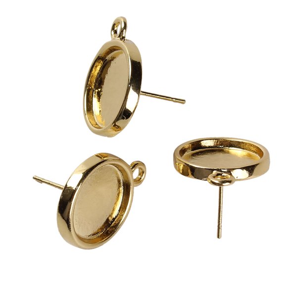 E153 – 10 pcs. Gold Plated Earring Posts Studs Settings Bezels with Loop Cabochons Tacks- 13mm Glue Pad Setting