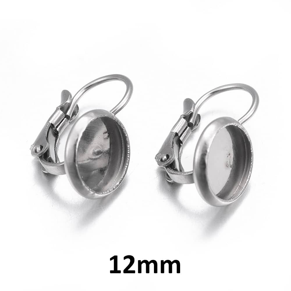 E226 – 10 pcs. 304 Stainless Steel Earring Clips Settings Lever Back Bezels Cabochons – 12mm Glue Pad Setting – Small Profile Lever