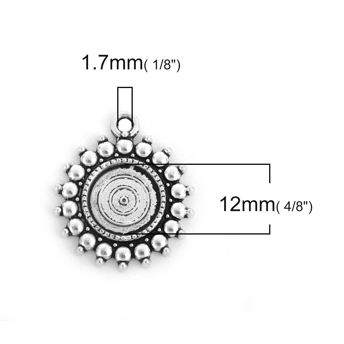 P305 - 10 pcs. Antique Silver Circle Round Bezel Cabochon Pendant Tags Trays - 12mm Glue Pad Settings - Ball Frame Design