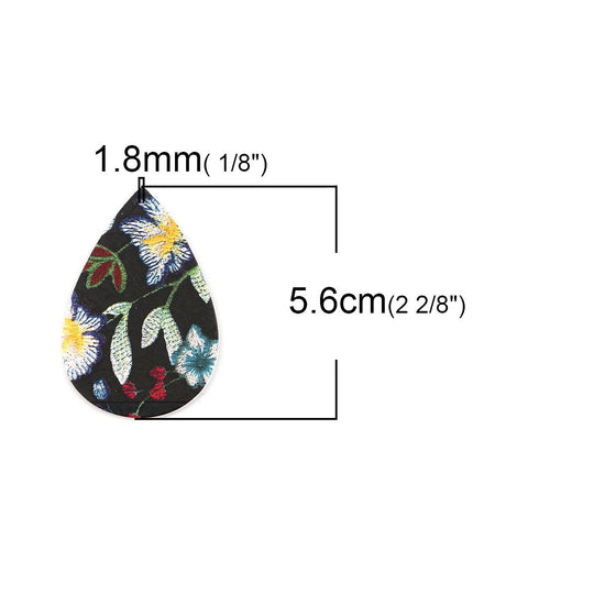 P228 - 10 pcs. Black Multicolor Floral Embroidered Faux Leather Dangle Charms Pendants - Teardrop - 56mm (2.2") - Double Sided