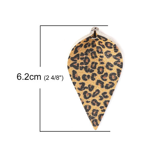 P233 - 10 pcs. Leopard Faux Leather Dangle Charms Pendants - Pinch Leaf - Black Yellow - Silver Tone Jump Ring - 62mm (2.5") - Double Sided