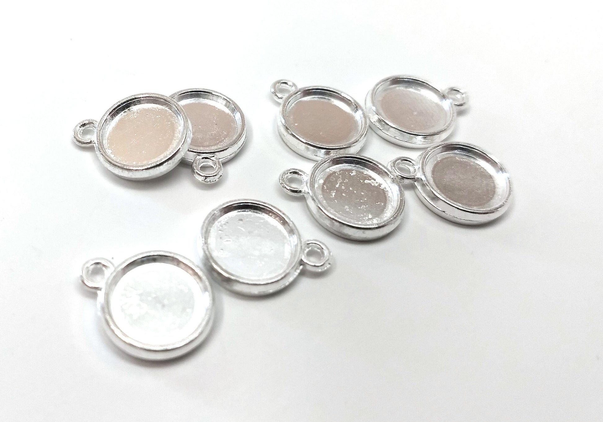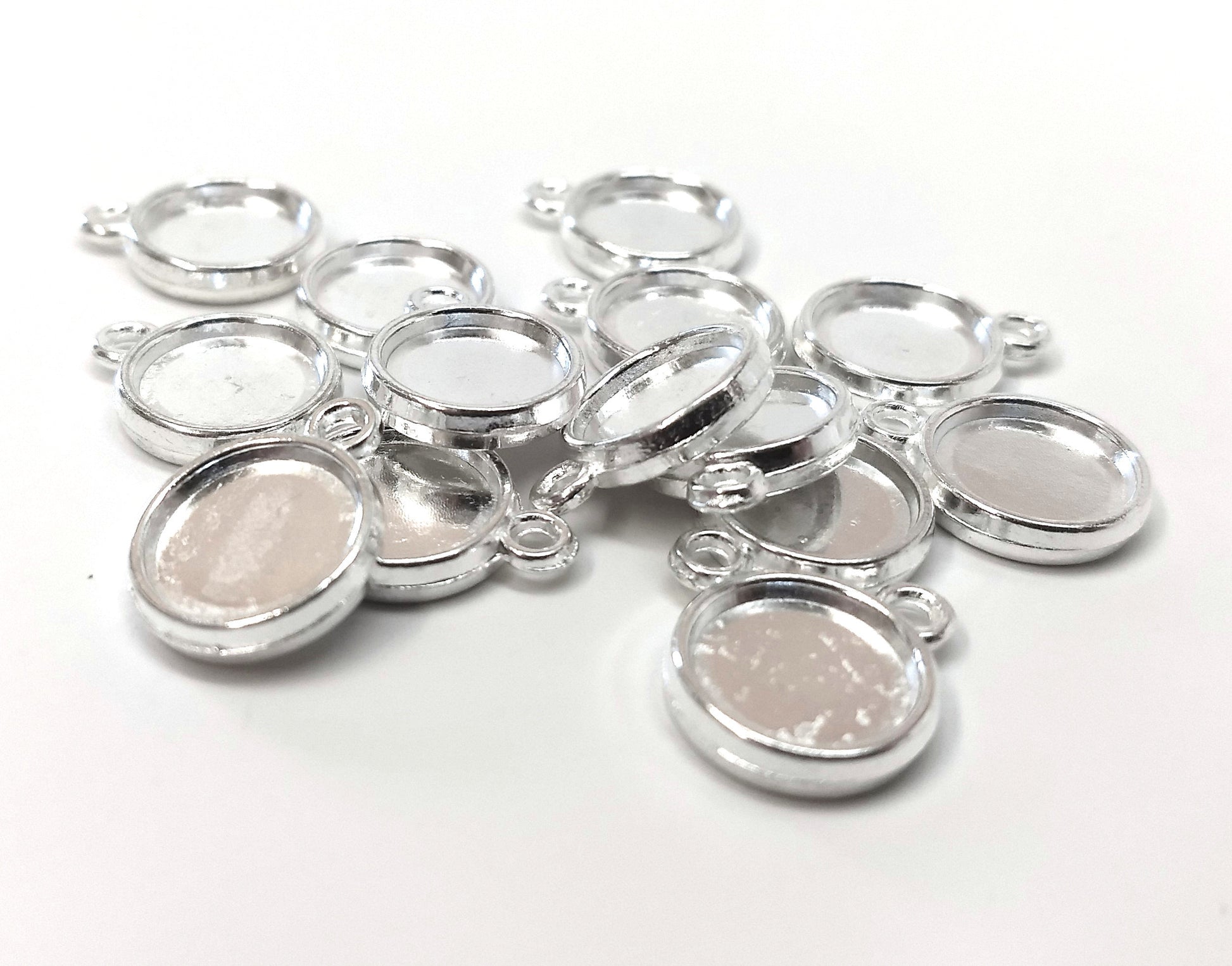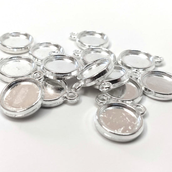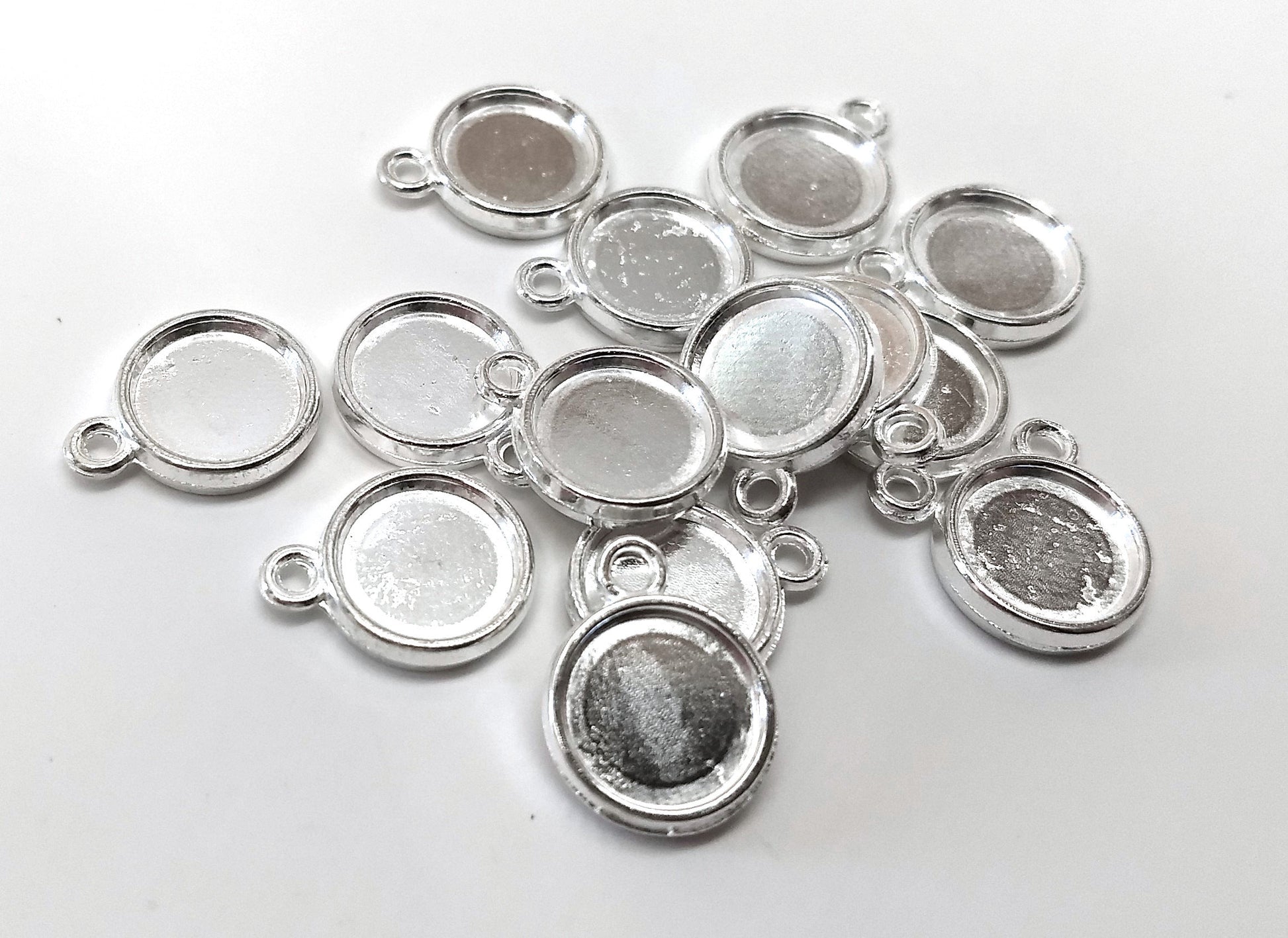 P364 - 10 pcs. Silver Tone Circle Round Bezel Cabochon Pendant Tags Trays - 10mm Glue Pad - Double Sided - Single Loop