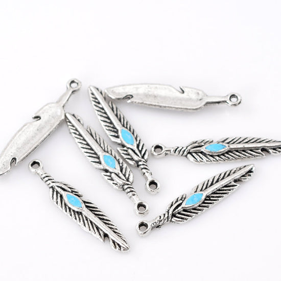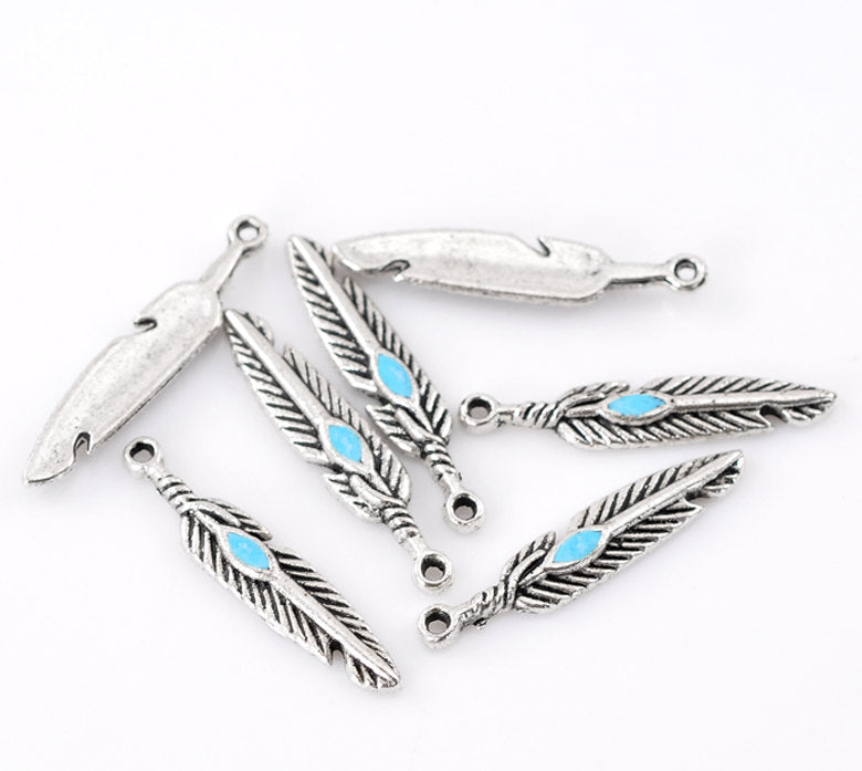 Brand NEW 10 Antique Silver Feather Blue Enamel Charms Pendants