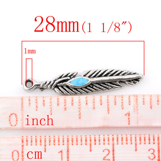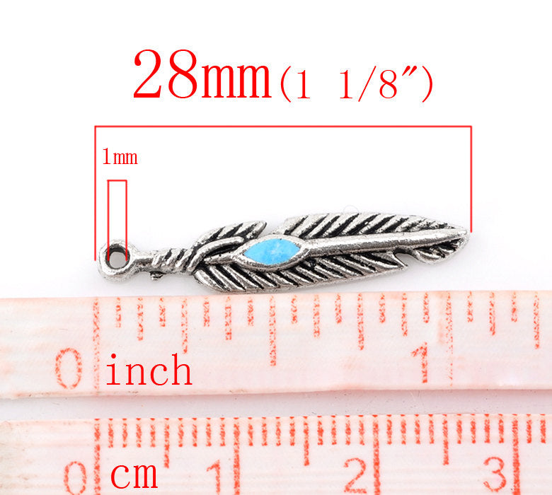 P198 - 10 pcs. Antique Silver Feather Blue Enamel Charms Pendants - 28x5mm