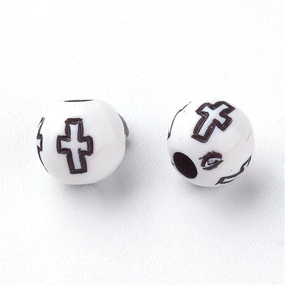 White Acrylic Round Spacer Beads – Cross Design – Imittaion wood