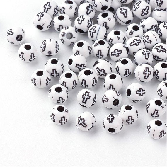 BD026 - 200 pcs. White Acrylic Round Spacer Beads - 6mm - Cross Design - Hole Size: 2mm - Imitation Wood
