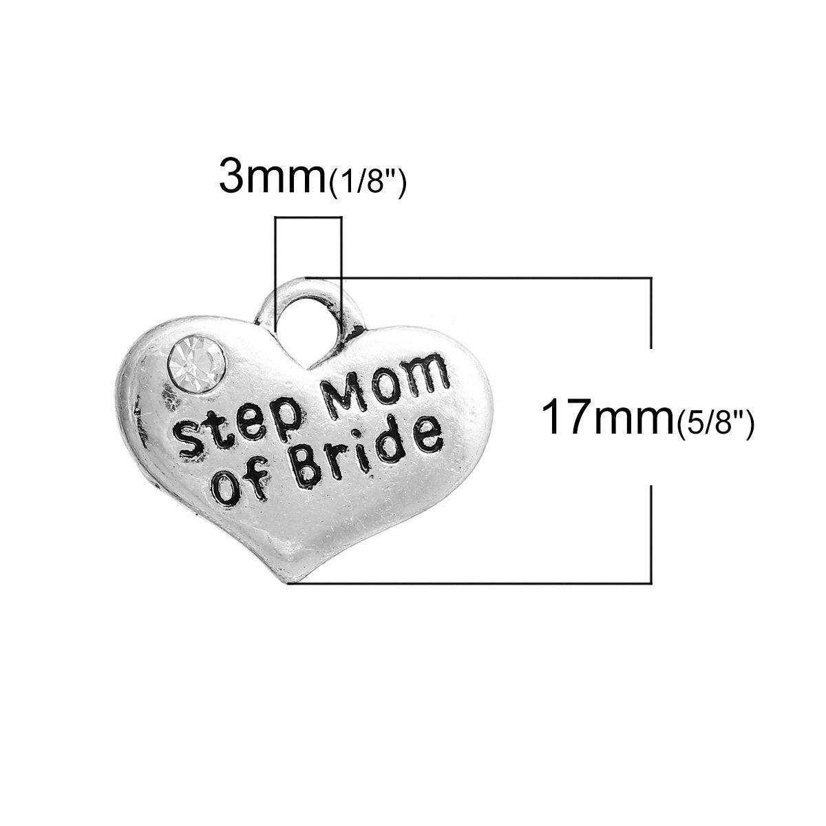 Antique Silver Rhinestone Charm with “Step Mom of Bride” written on it