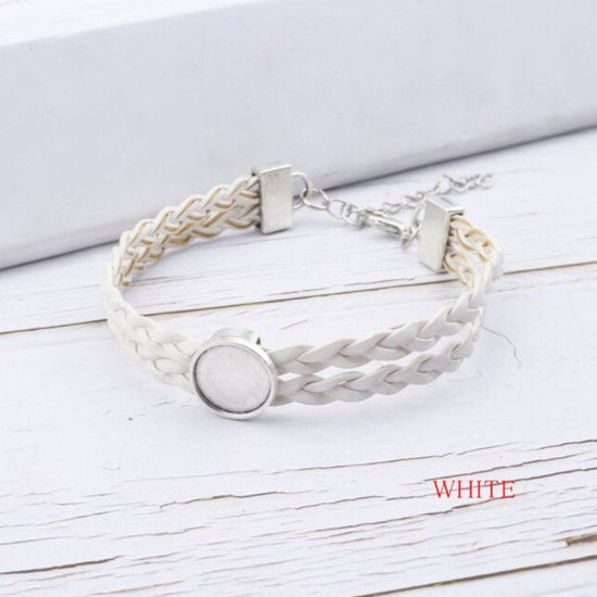 B074 - 2 pcs White Faux Leather Bracelets with 12mm Glue Pad Bezel Trays and Extender Chains - Adjustable from 7" to 9" - Double Braided Cord