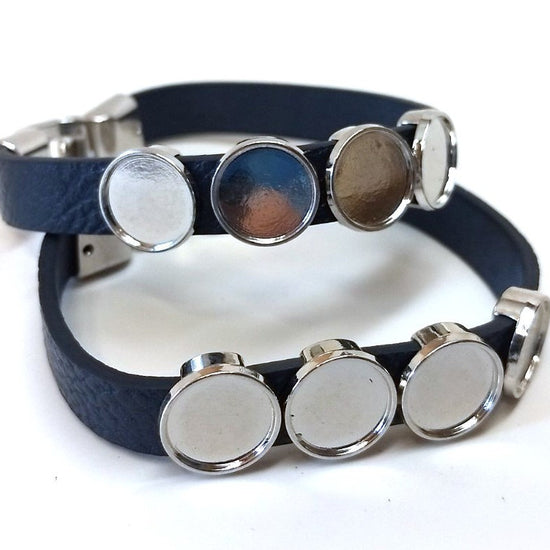 Blue Faux Leather Bracelets with 12mm Bezel Trays and Extender Chains – 4 Settings