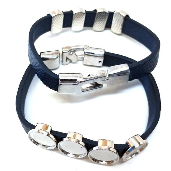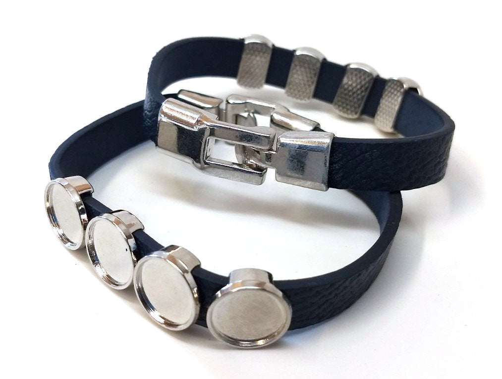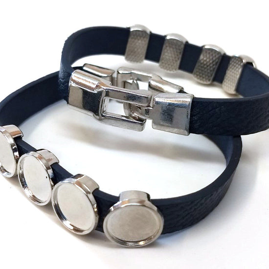 B082 - 2 pcs. Blue Faux Leather Bracelets with 12mm Glue Pad Bezel Trays and Extender Chains - Adjustable from 7" to 9" - 4 Settings