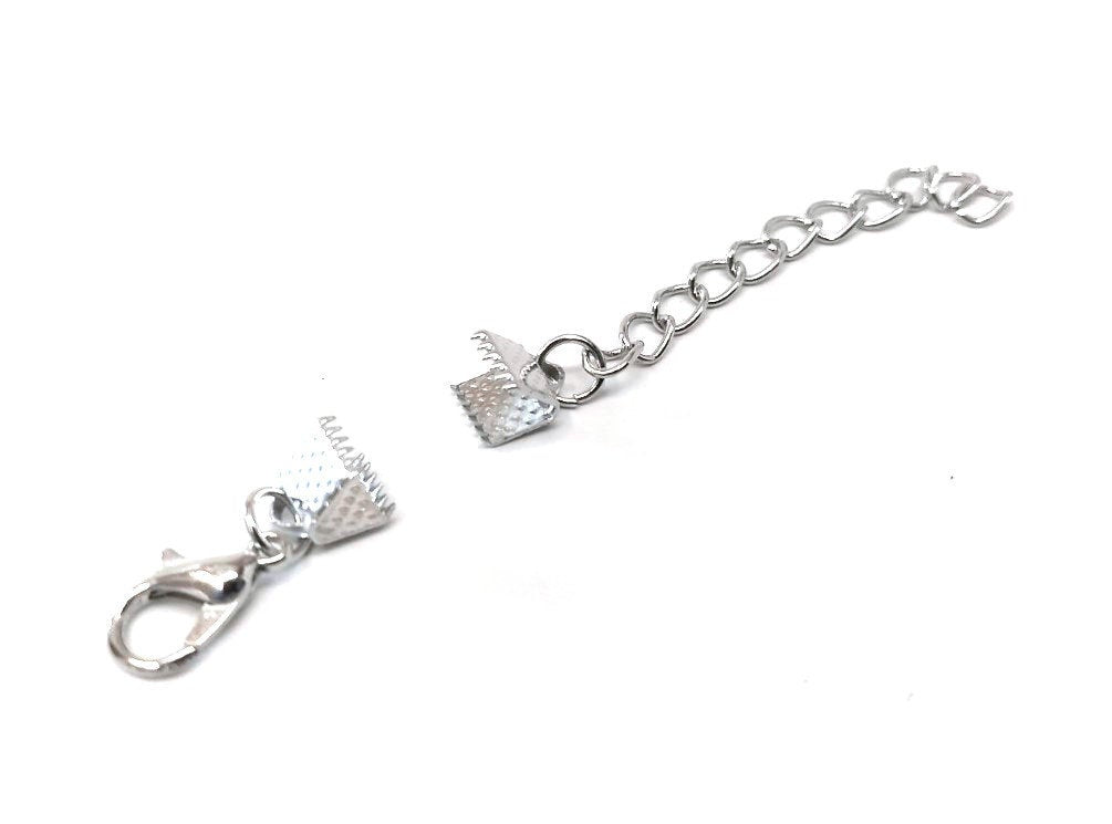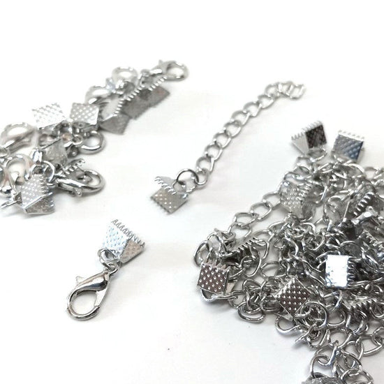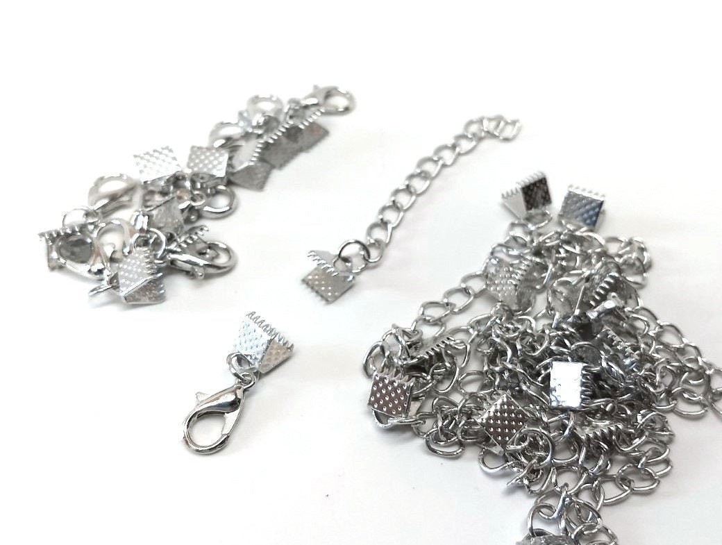 Items: Silver Tone Bracelet and Necklace End Tips Crimps with Lobster Claw Clasps and Extender Chains – For 10mm Cords