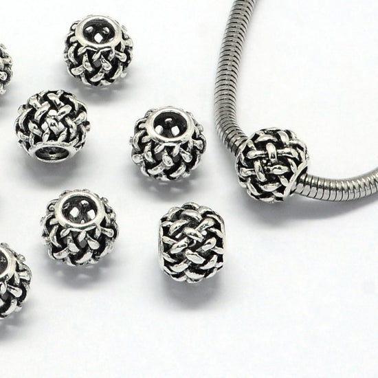 BD029 - 10 pcs Antique Silver Weave Metal Rondelle Ball Spacer Beads - 11mm - Large Hole: 4.5mm - Fits European Cords and Paracord!