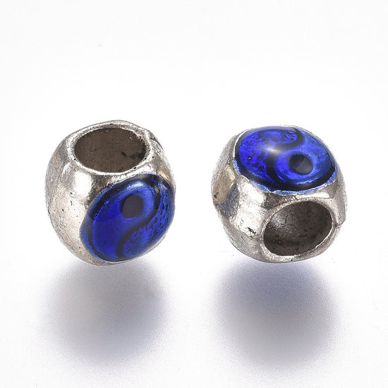 BD184 - 10 pcs. Antique Silver Metal Enamel Tai Ji Painted Spacer Beads - 10mm - Large Hole: 4mm - Fits European Cords
