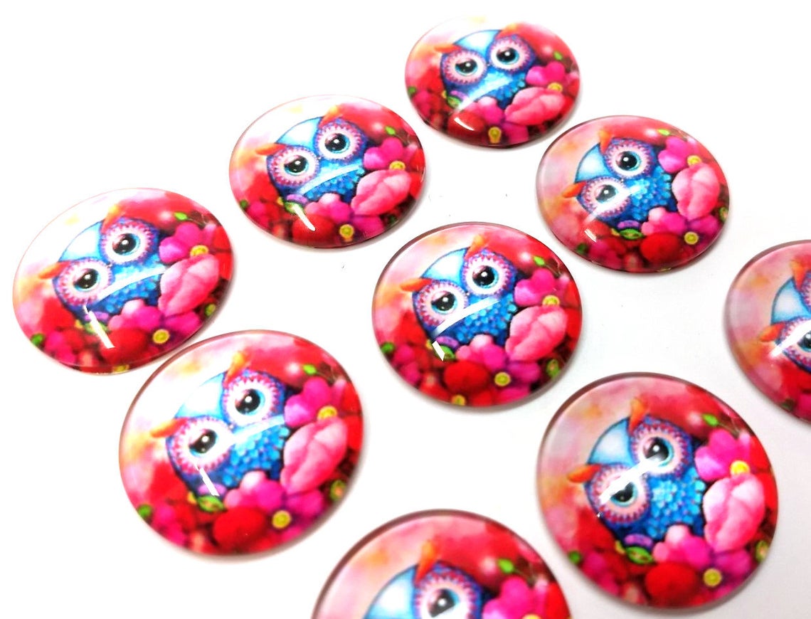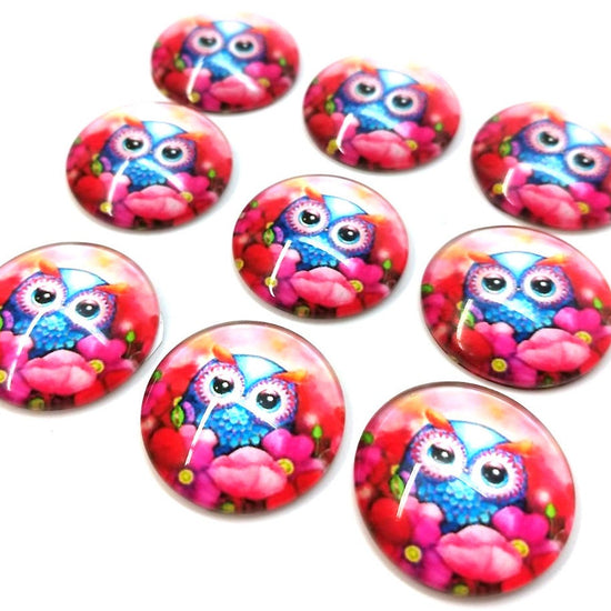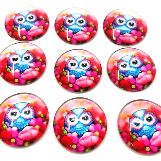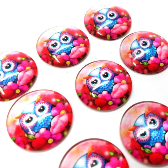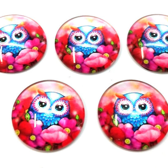 CA1030 - 5 pcs Circle Owl Glass Round Dome Seals Tiles Cabochons - 25mm (1 inch) - Pink