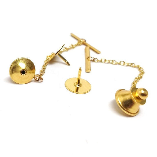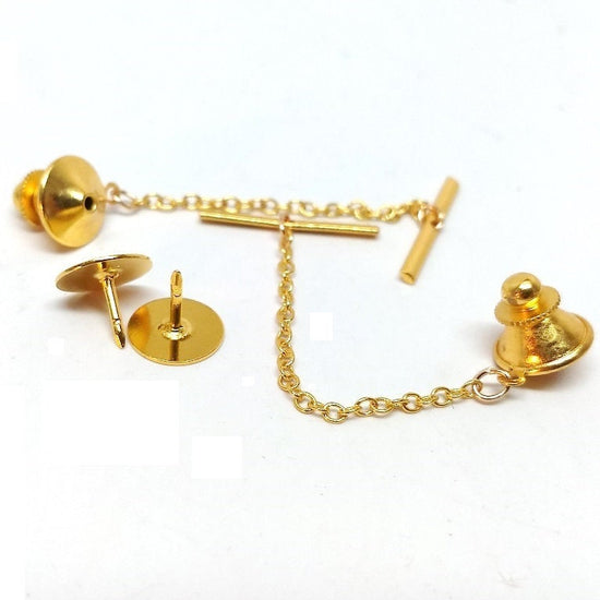 TC041A - 10 Sets - Gold Tone Tie Tacks (Spring Loaded Clutch and Chain) - 20mm Bar - 50mm Chain - 11mm Clutch