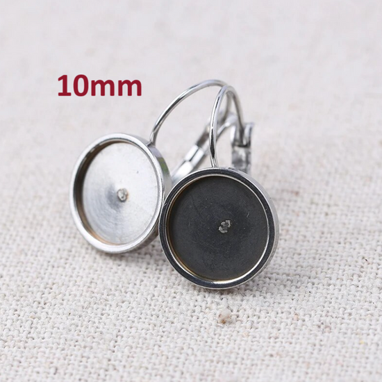 E658 - 10 pcs. (5 pairs) 304 Stainless Steel Silver Tone Earring Clips Settings Lever Back Bezels Cabochons - 10mm Glue Pad Setting - Flat Design