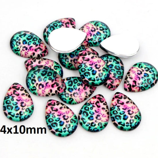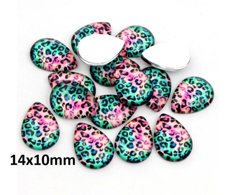 GT019 - 10 pcs Teardrop Leopard Glass Dome Seals Tiles Cabochons - 14mm x 10mm - Teal and Pink