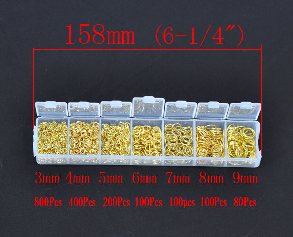 J179 - Box with Assortment of 1780pcs Gold Plated Open Jump Rings- 3mm to 9mm