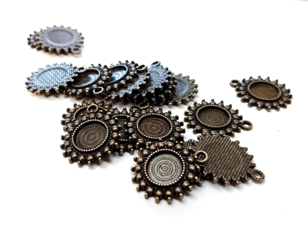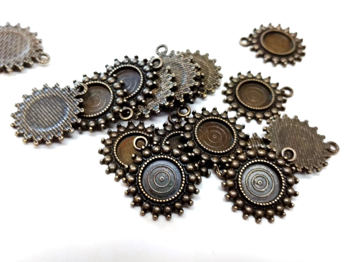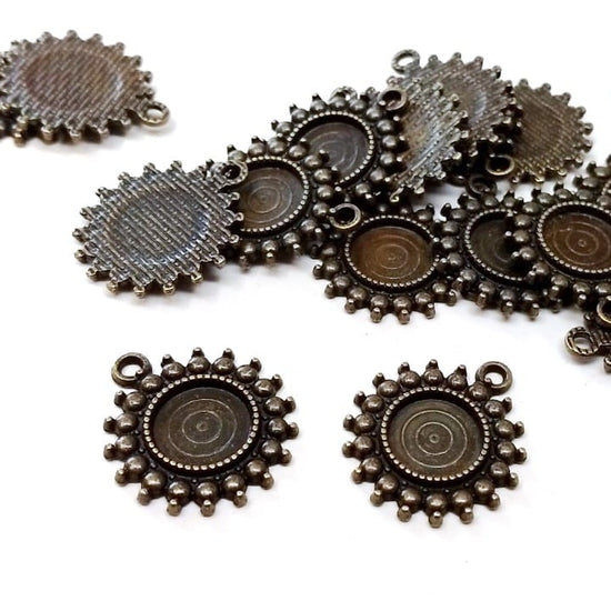 MP0051 - 10 pcs. Antique Bronze Circle Round Bezel Cabochon Pendant Tags Trays - 12mm Glue Pad Settings - Ball Frame Design
