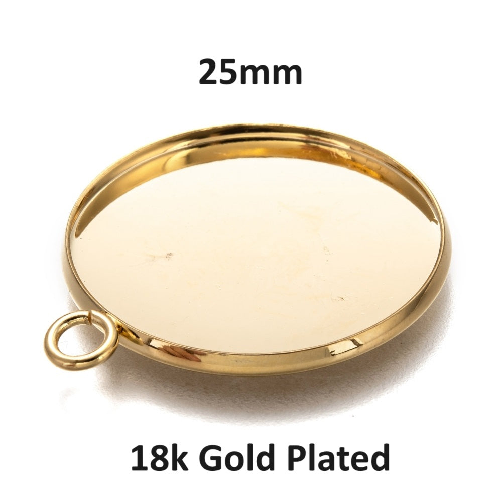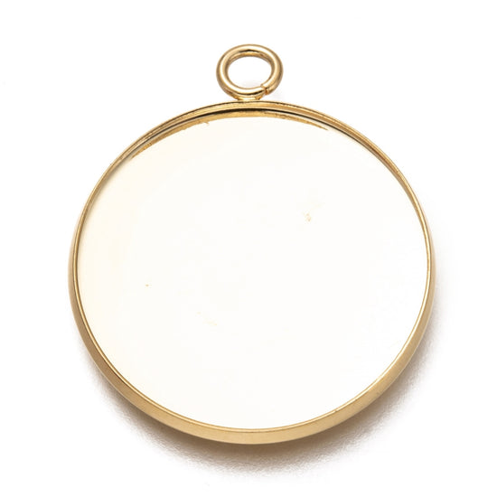 MP0075 - 5 pcs. 304 Stainless Steel Circle Round Bezel Pendant Tags Trays - 25mm Glue Pad Setting - Single Loop - 18k Gold Plated - Tarnish Resistant