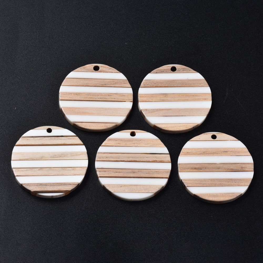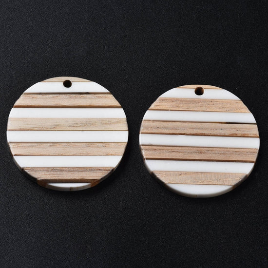 RW0026 - 4 pcs. Brown and White Resin and Wood Round Flat Pendant - 30mm - (1.18") - Stripe Pattern