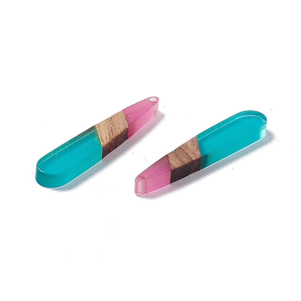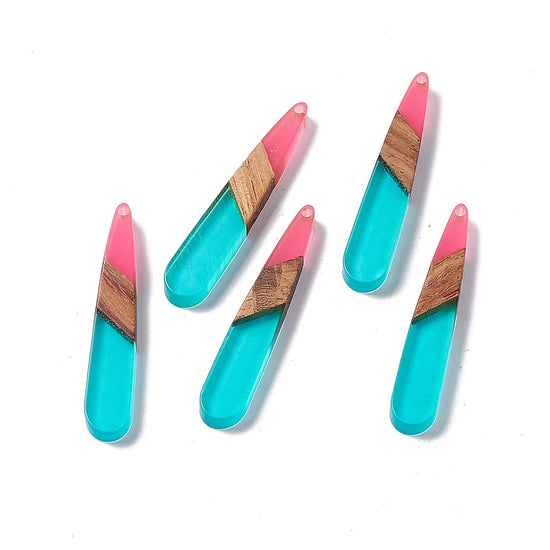 RW0066 - 4 pcs. Clear Pink and Teal Stripe Resin and Wood Teardrop Flat Pendant - 44mm x 8mm - (1.73" x 0.32")