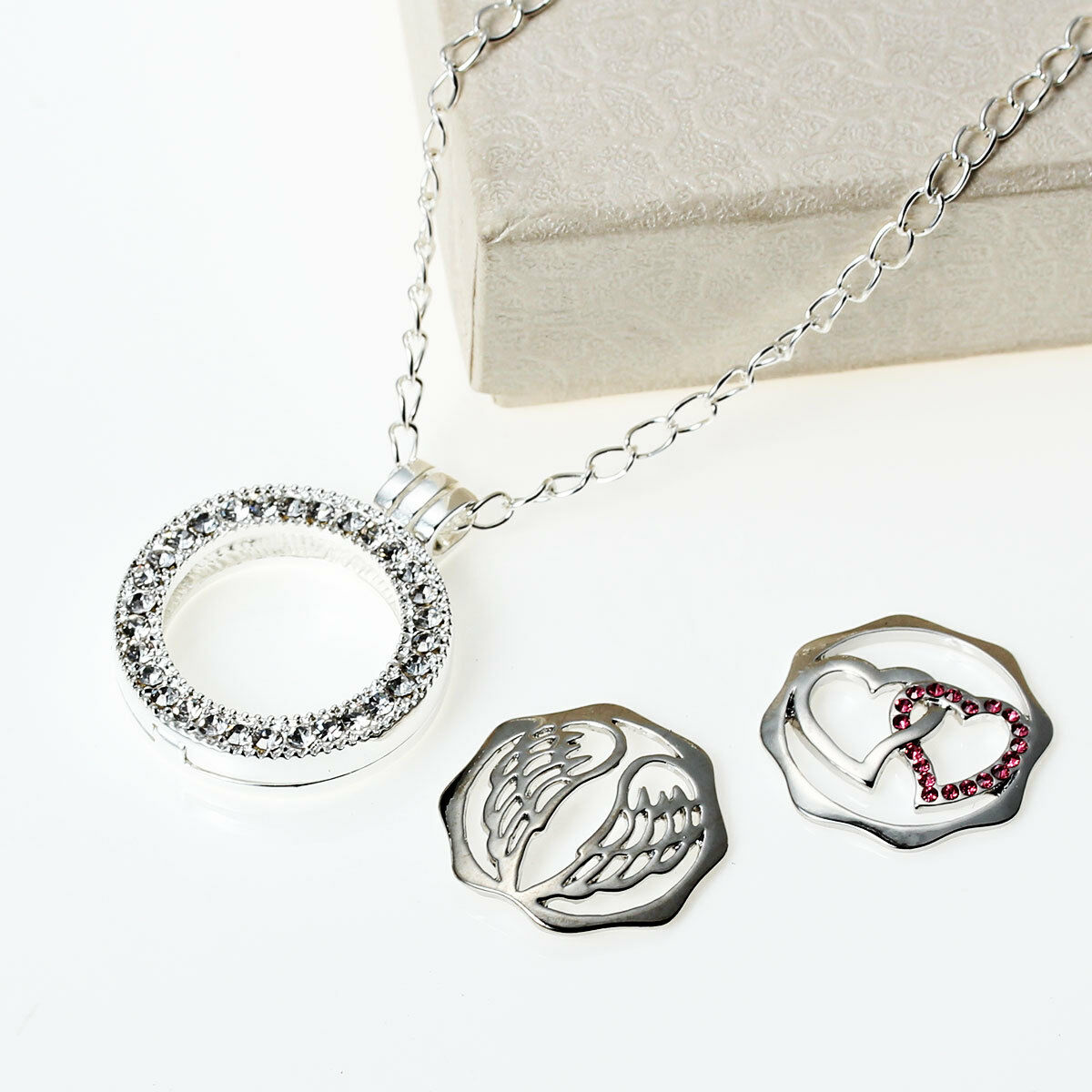 Silver Plated Necklace with Interchangeable Locket – Contains 2 Discs (1 with Wings and 1 with Hearts and Pink Rhinestones) – Perfect as a Valentine’s Day Present! It comes with an organza bag to be ready to give as a gift!